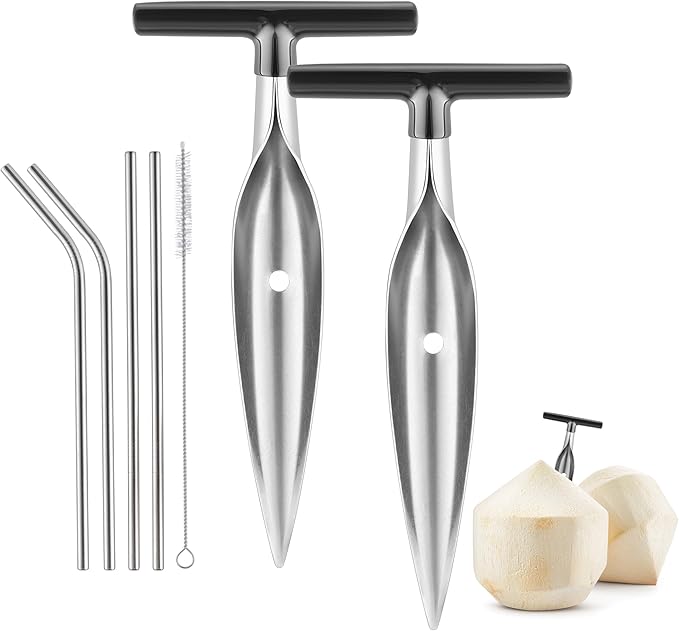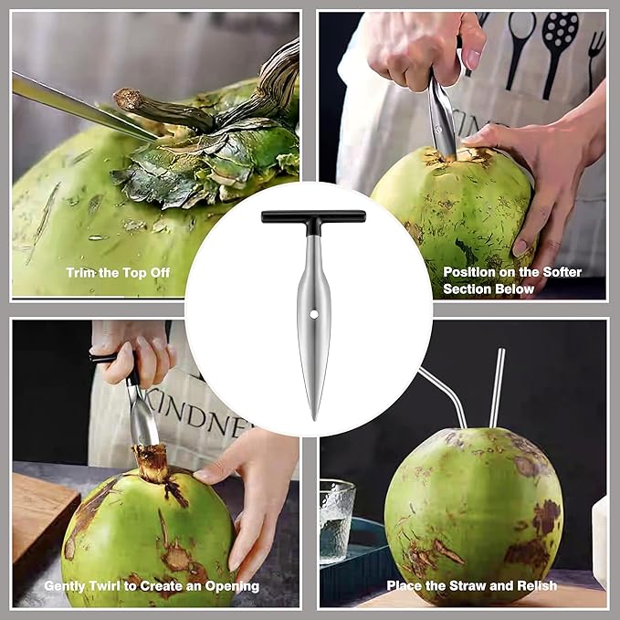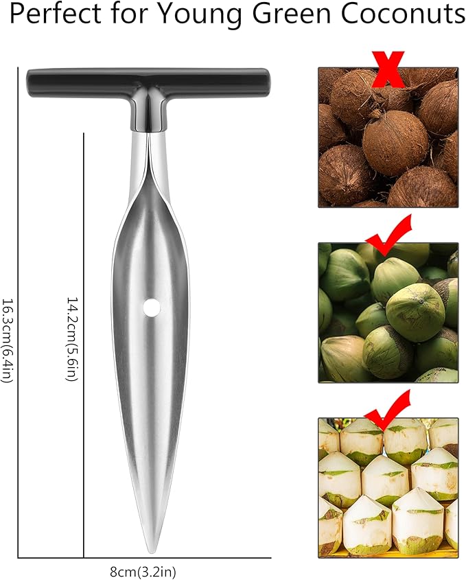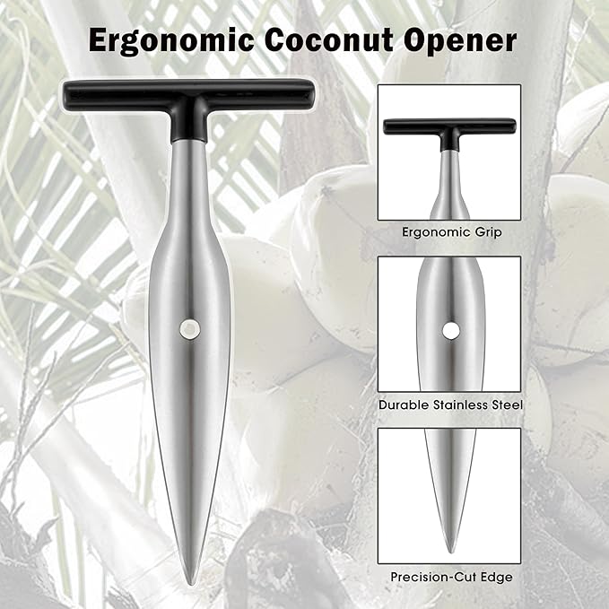 Heavy-Duty Food Grade Stainless Steel – Built to Last: Each coconut cutter is made from high-quality food-grade stainless steel, ensuring durability, rust resistance, and long-term use. The solid construction makes it tough enough to pierce multiple coconuts without bending or dulling. it's safe for direct contact with food and liquids, and dishwasher safe for effortless cleaning