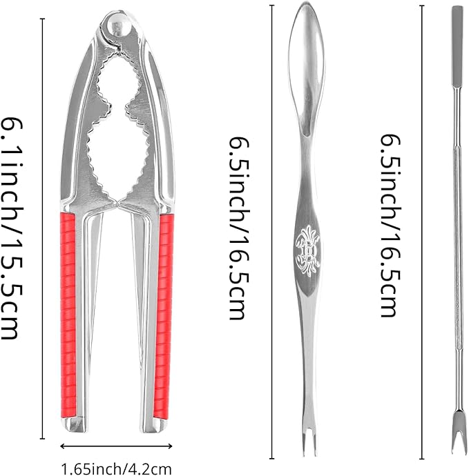 Package: 1Pcs of Red nut cracker. 2Pcs Stainless Steel Seafood Forks. walnut cracker size(L*W): 15.5 x 4.2 cm/ 6.1 x 1.65 inch. Great for pecan, crab, lobster, shrimp and more.