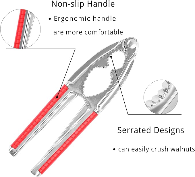 Non-slip handle: Our nut cracker are designed with non-slip handle, anti slip design, good grip. Comfortable for you to hold and use. The edges are smooth, so it's safe to use without cutting your hands.